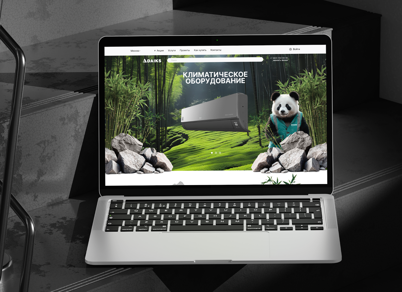 1. Центральный элемент — климатическое оборудование — словно парит в пространстве среди изумрудных бамбуковых зарослей и мягких зеленых мхов.